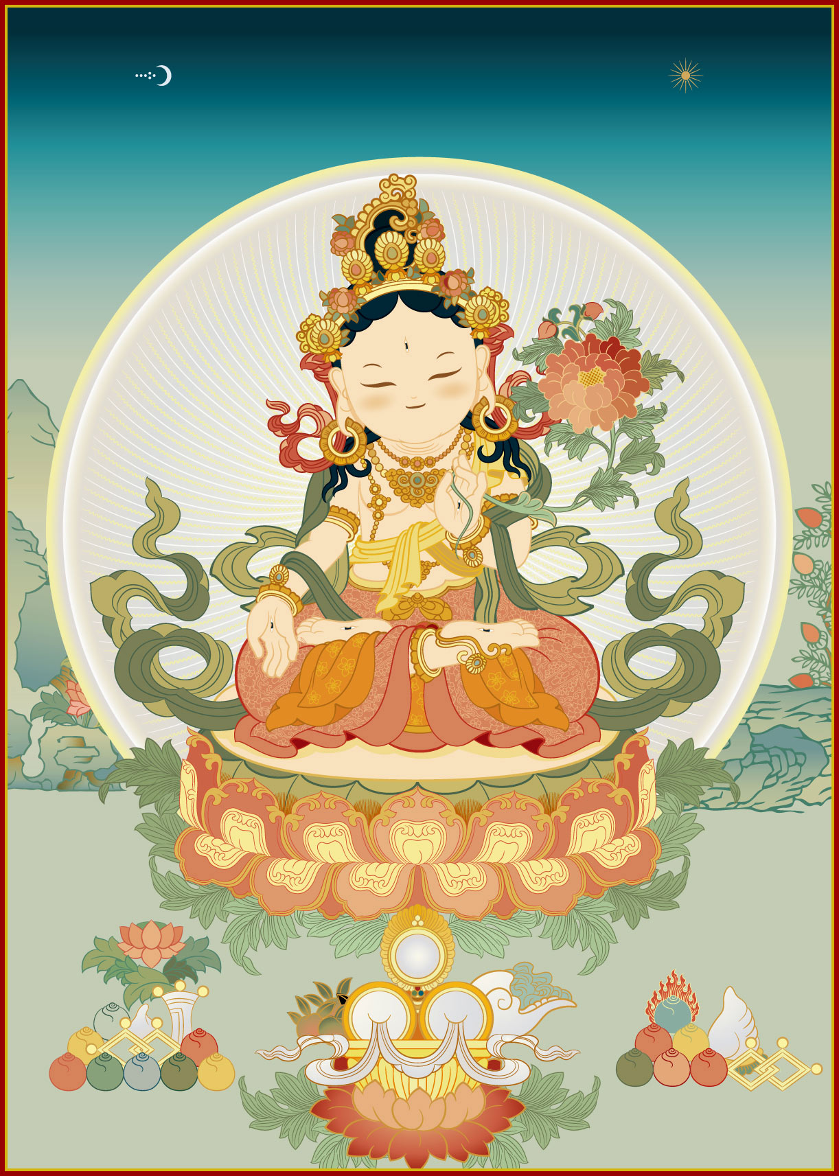 Her pure compassion for our suffering, which is thought to be greater even than a mother's love for her child, is symbolized in images of White Tara by her white color. Her whiteness also indicates the "undifferentiated truth of the Dharma."
